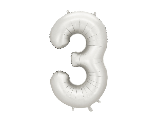 Satin foil Balloon Number 3 in silver, size before inflating approx. 100 cm (39''), size after inflating approx. 86 cm (34''). To be inflated with air or helium. The set includes a straw. The balloon is self-sealing. It has hooks for easy attachment to decorations.