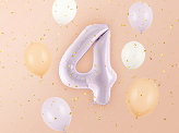Pastel foil balloon Number 4 in purple, size before inflation approx. 86 cm (34''), size after inflation approx. 72 cm (28''). Can be inflated with air and helium. The set includes a straw. The balloon is self-sealing. Features hooks for easy decoration mounting.