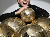 Disco mirror ball, champagne gold, diameter 40 cm. The ball includes a mounting bracket. Available in 3 sizes: 20, 30, and 40 cm in diameter.