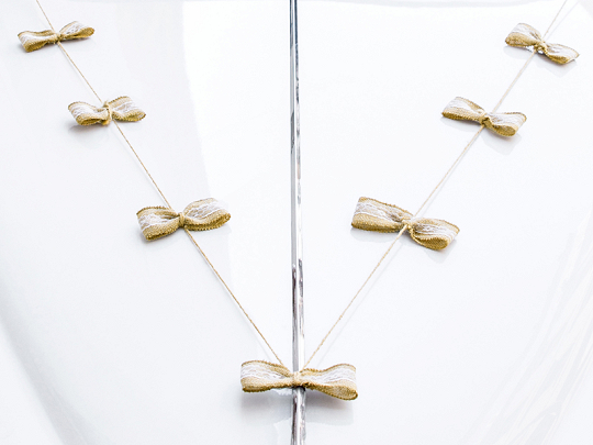 Car decorations kit, set contains: garland made of burlap (length approx. 6 m), 4 bows made of burlap for door-handle (width approx. 13.5 cm, height approx. 18 cm), bow made of burlap with gold cans (size of a bow: width approx. 24.5 cm, length approx. 14 cm, cans - 3 pcs), suction cups (6 pcs) and fishing line (approx. 12 m).
